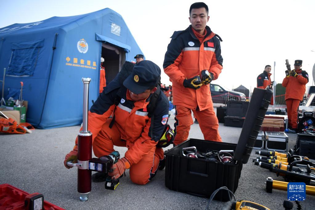 2月11日,在位于土耳其哈塔伊省哈塔伊体育馆外的中国救援队营地,救援队队员检查设备。