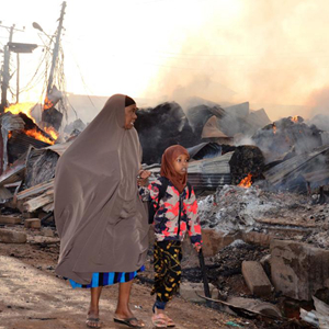 2月13日,在乌干达首都坎帕拉近郊的基塞尼,人们走过一处燃烧的废墟。