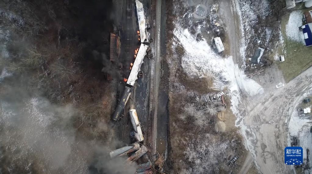 这张美国国家运输安全委员会发布的无人机视频截图显示的是有毒化学品运载列车脱轨事故现场。新华社发