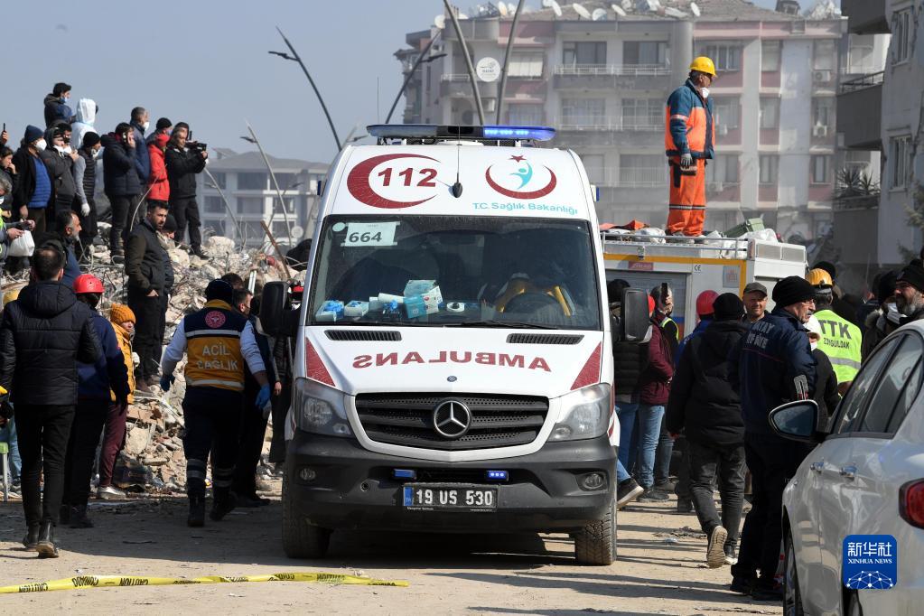 2月13日,在土耳其哈塔伊省安塔基亚市,救护车停在地震废墟旁。