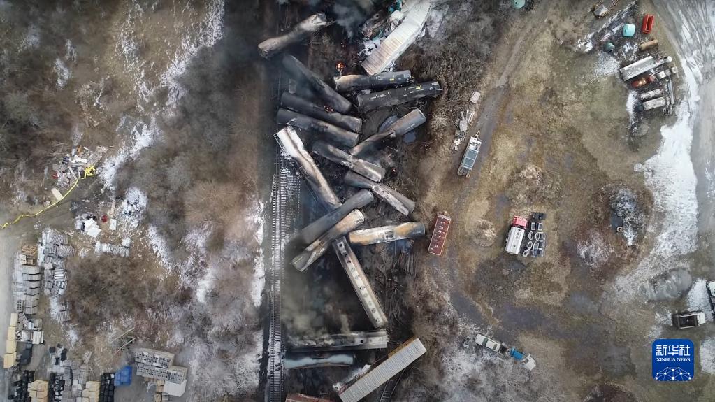 这张美国国家运输安全委员会发布的无人机视频截图显示的是有毒化学品运载列车脱轨事故现场。