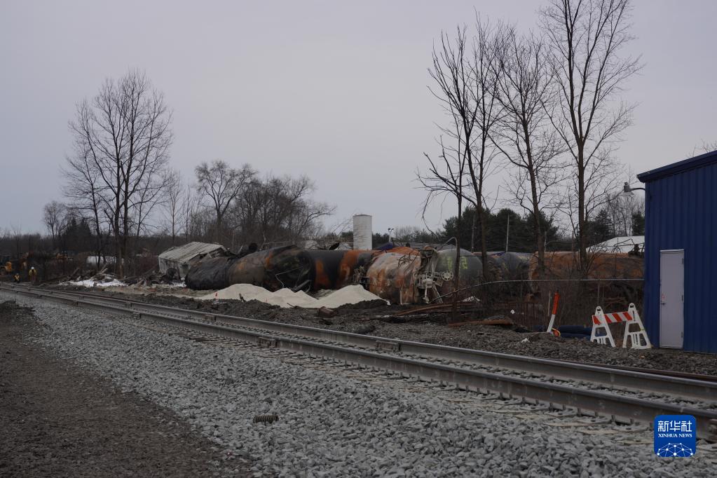 这是2月14日在美国俄亥俄州东巴勒斯坦镇拍摄的脱轨列车残骸。
