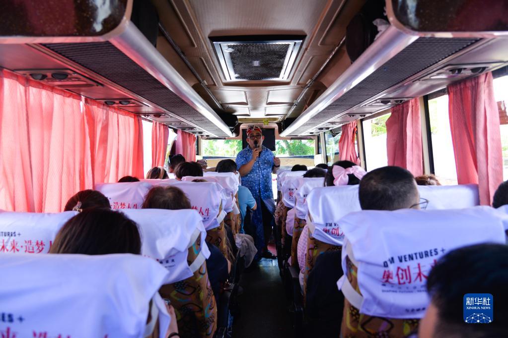 2月12日,在印度尼西亚巴厘岛,当地导游(中)在从机场前往酒店的大巴车上向中国游客介绍巴厘岛。