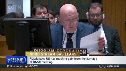 ▲ 2022年9月,联合国安理会就“北溪”天然气管道泄漏事件举行公开会。俄罗斯常驻联合国代表涅边贾手举波兰前外长“谢谢你,美国”的推文截图,指出美国有破坏“北溪”管道的动机。
