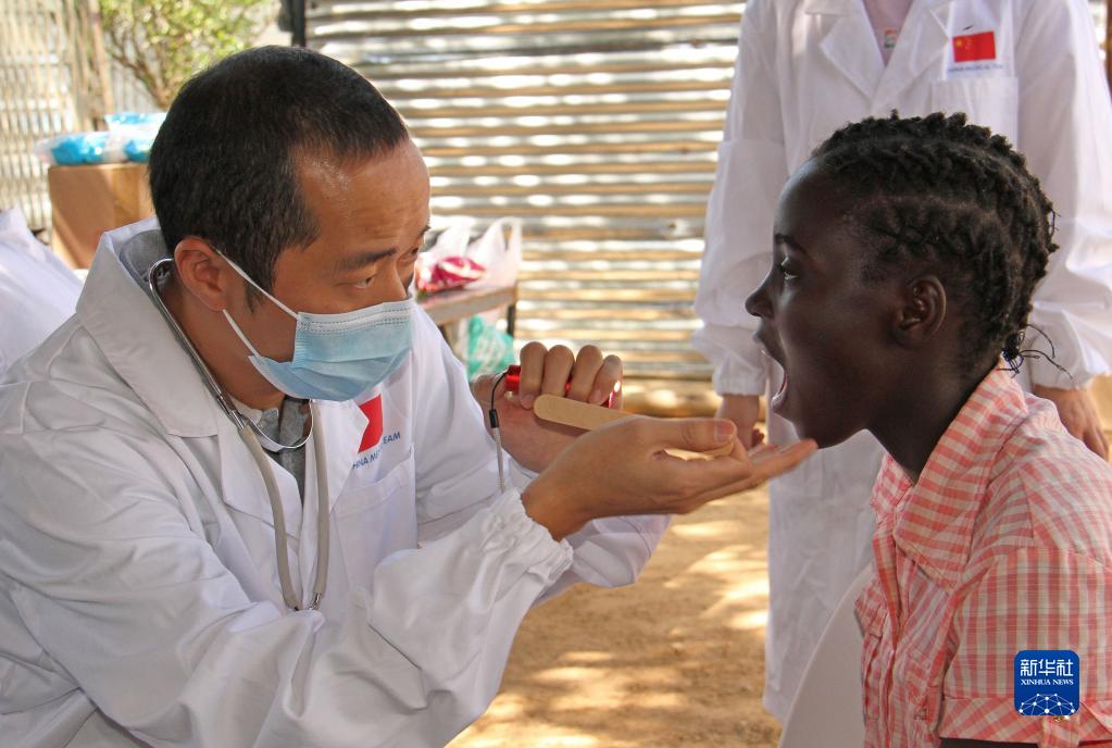 2月16日,在纳米比亚首都温得和克哈瓦那非正式定居点的弗兰斯艺术培训中心,中国医生为一名儿童检查口腔。