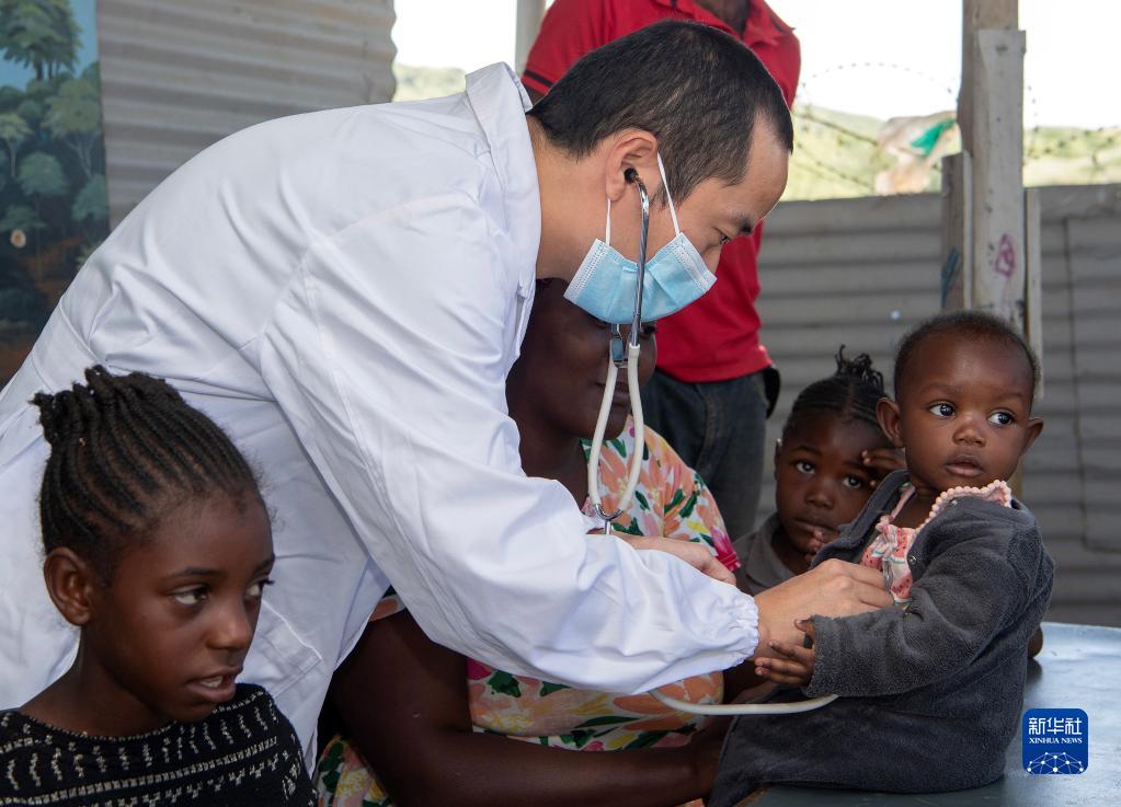2月16日,在纳米比亚首都温得和克哈瓦那非正式定居点的弗兰斯艺术培训中心,中国医生为一名儿童体检。