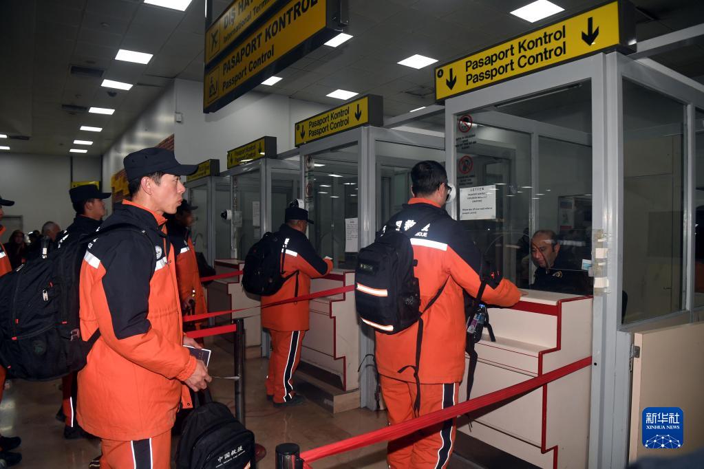 2月16日,中国救援队队员在土耳其阿达纳国际机场办理乘机手续。