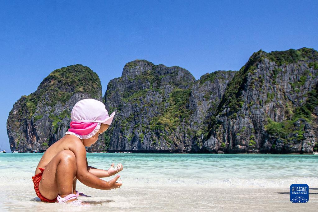 2月16日,小朋友在泰国皮皮岛国家公园玩耍。