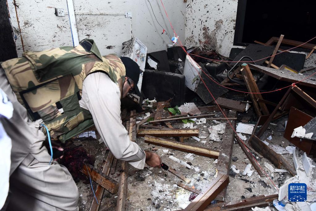 2月17日,在巴基斯坦卡拉奇,安全人员检查遇袭警察局现场。
