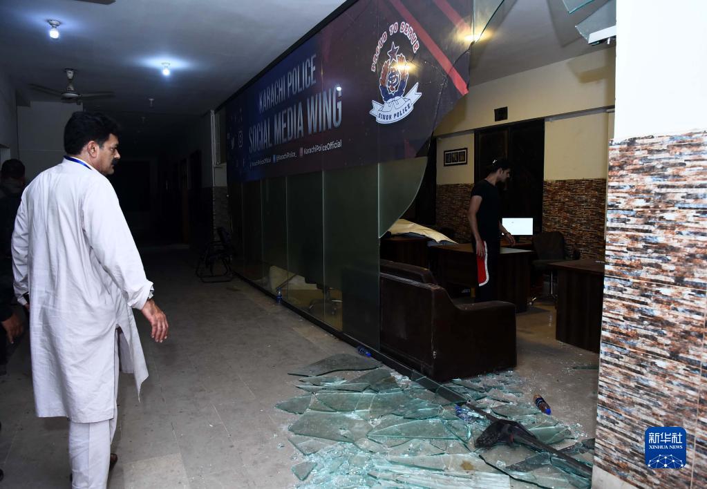 这是2月17日在巴基斯坦卡拉奇拍摄的遇袭警察局的建筑内部。