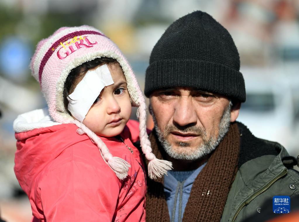 2月11日,一名抱着孩子的男子走在土耳其哈塔伊省安塔基亚市街头。