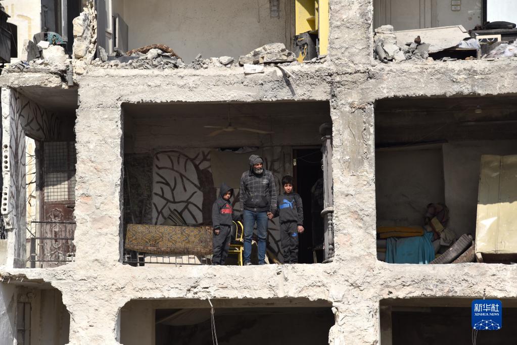 2月13日,在叙利亚地震灾区阿勒颇,人们站在受损的建筑中向外张望。