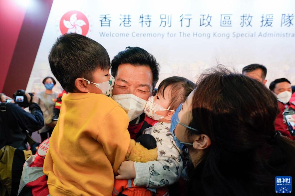 2月17日,在香港特区救援队赴土耳其救灾返港仪式上,救援队队员与亲友相见。新华社发