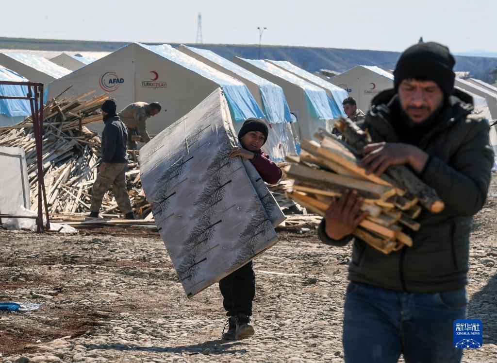 2月18日,在土耳其南部阿德亚曼省阿德亚曼市,人们搬运物品。
