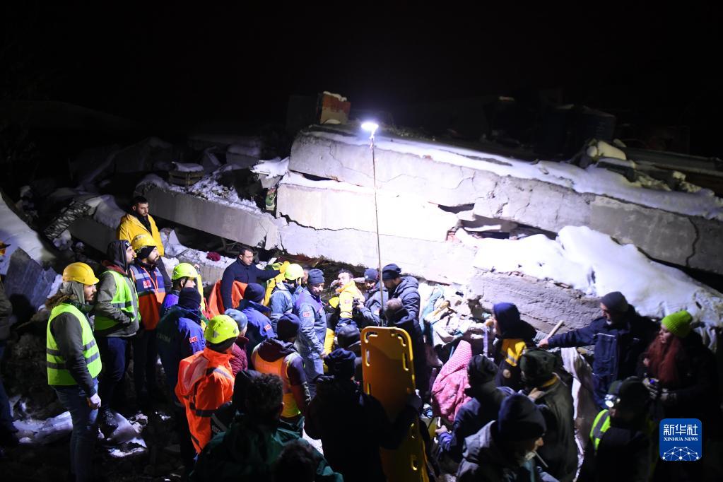 2月7日,救援人员在土耳其卡赫拉曼马拉什省南部的埃尔比斯坦地区开展地震救援工作。