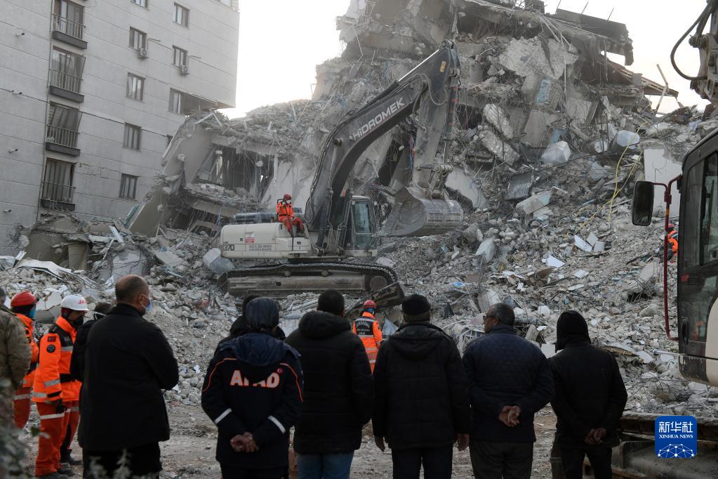 2月21日,工作人员利用大型机械在土耳其哈塔伊省清理废墟。
