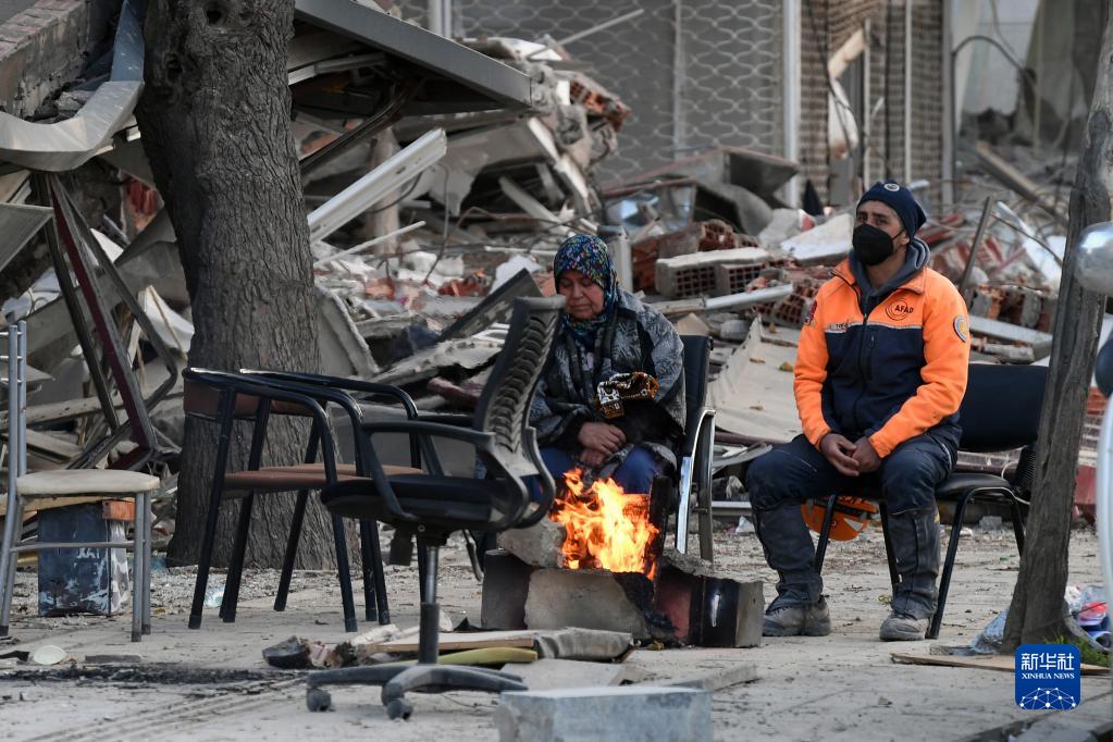 2月21日,在土耳其哈塔伊省,人们坐在震后废墟旁。