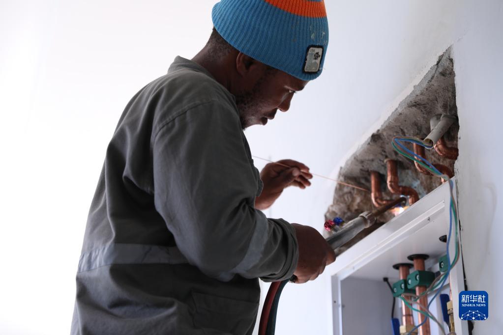 2月21日,工人在坦桑尼亚桑给巴尔岛姆布兹尼地区医院安装医用氧气相关设施。