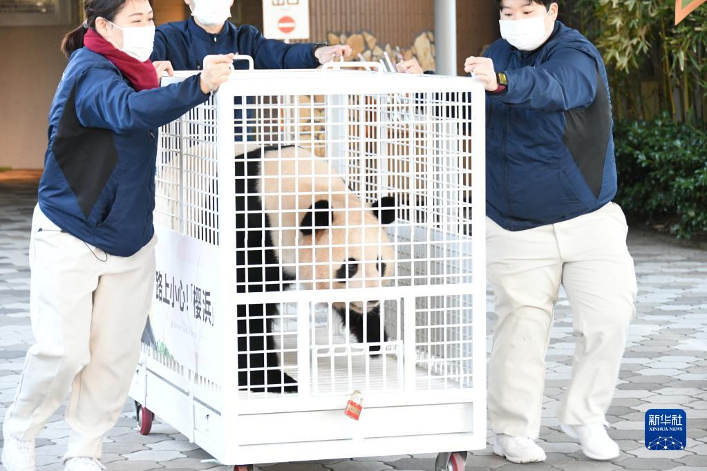 2月22日,在日本和歌山县白浜町的“冒险世界”乐园,工作人员运送大熊猫“樱浜”。