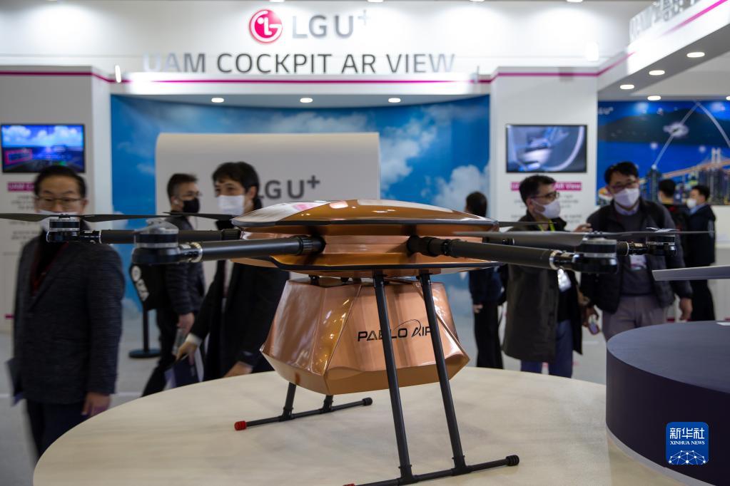 2月23日,参观者在韩国釜山举办的2023韩国无人机展上观看送货无人机。