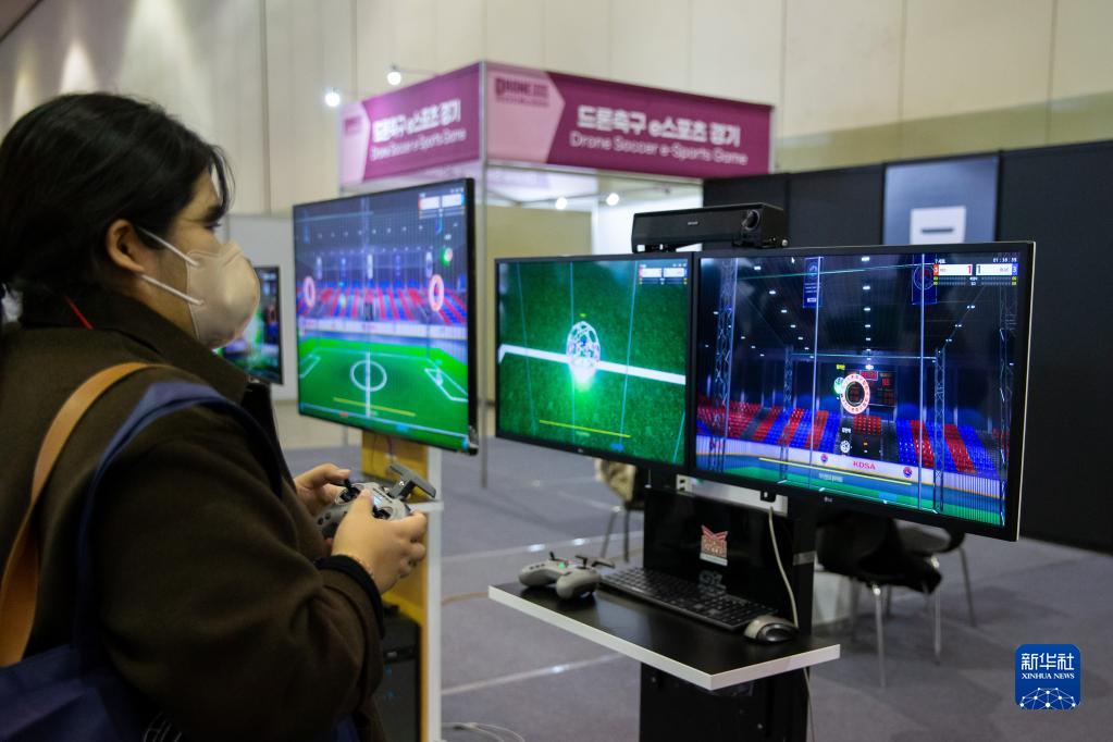 2月23日,参观者在韩国釜山举办的2023韩国无人机展上体验无人机游戏。