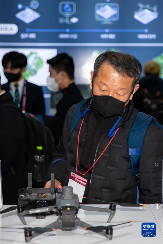 2月23日,参观者在韩国釜山举办的2023韩国无人机展上观看大疆无人机。