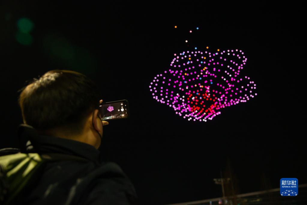 2月23日,参观者在韩国釜山用手机拍摄2023韩国无人机展上的无人机灯光表演。