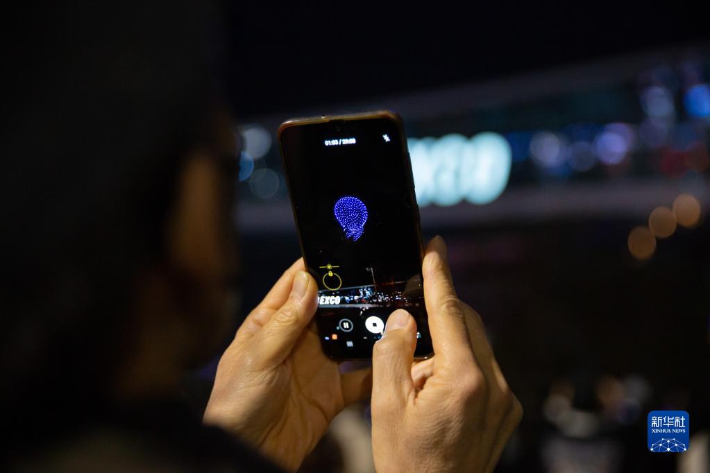 2月23日,参观者在韩国釜山用手机拍摄2023韩国无人机展上的无人机灯光表演。