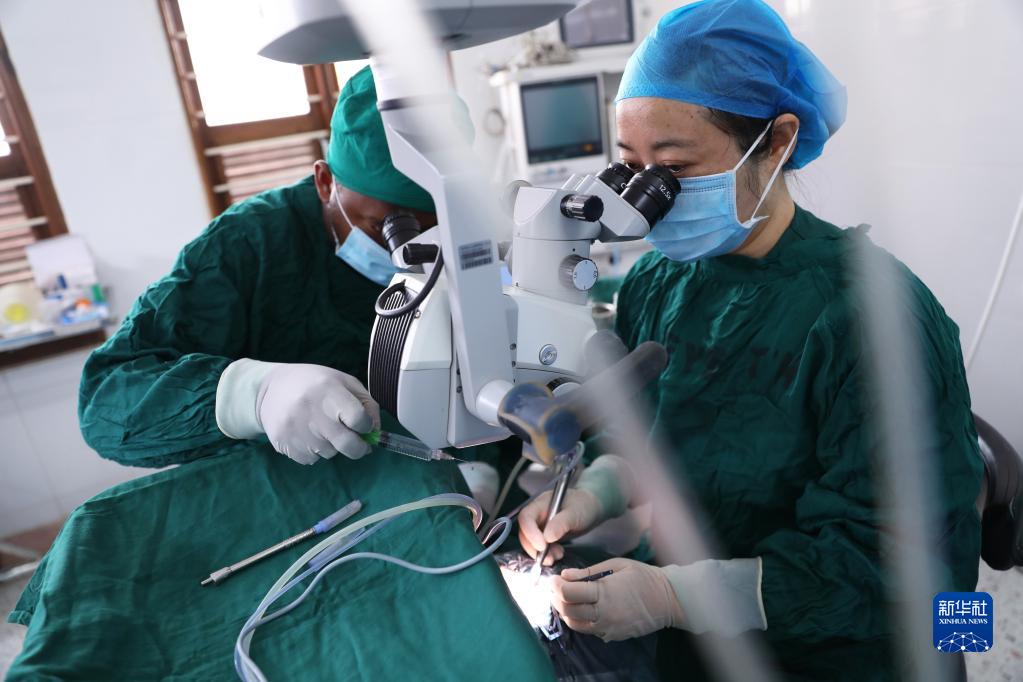 2月23日,在坦桑尼亚桑给巴尔岛纳兹莫加医院,眼科医生董莉莉(右)给病人做白内障超声乳化摘除手术。