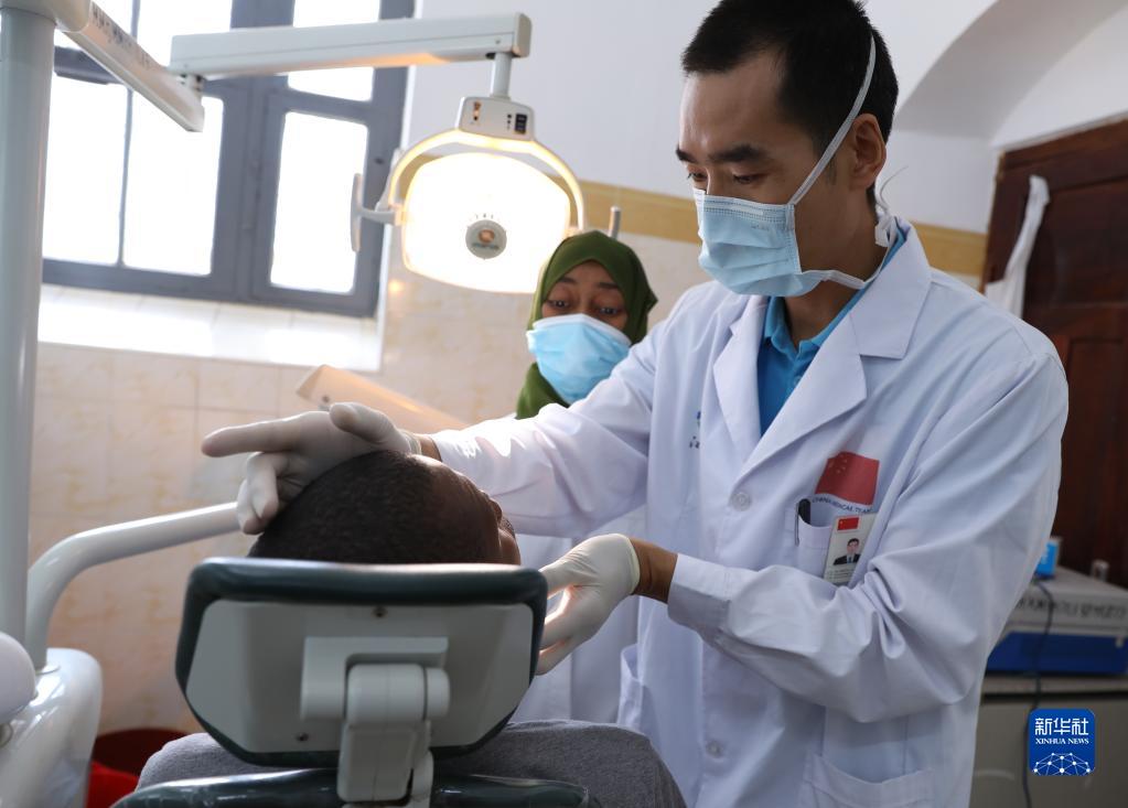 2月22日,在坦桑尼亚桑给巴尔岛纳兹莫加医院,口腔科医生盛磊给病人看病。