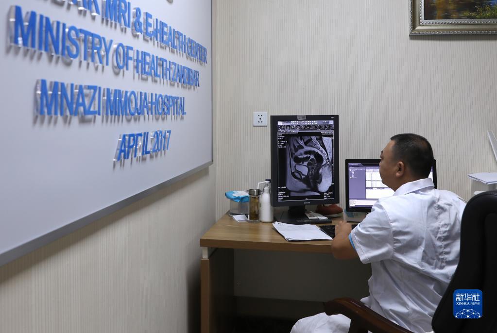 2月22日,在坦桑尼亚桑给巴尔岛纳兹莫加医院,影像科医生杨维柘查看核磁共振检查结果。