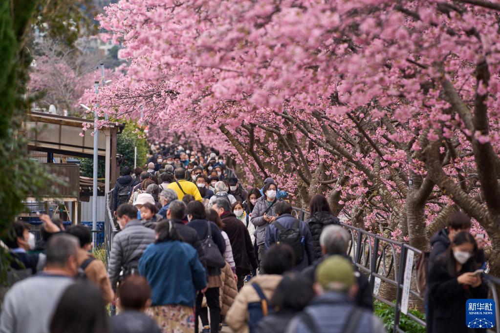 近日,日本静冈县河津町的河津樱满开,吸引众多游客前来观赏。河津樱于1955年在河津町被发现,以开花早、花期长而闻名。