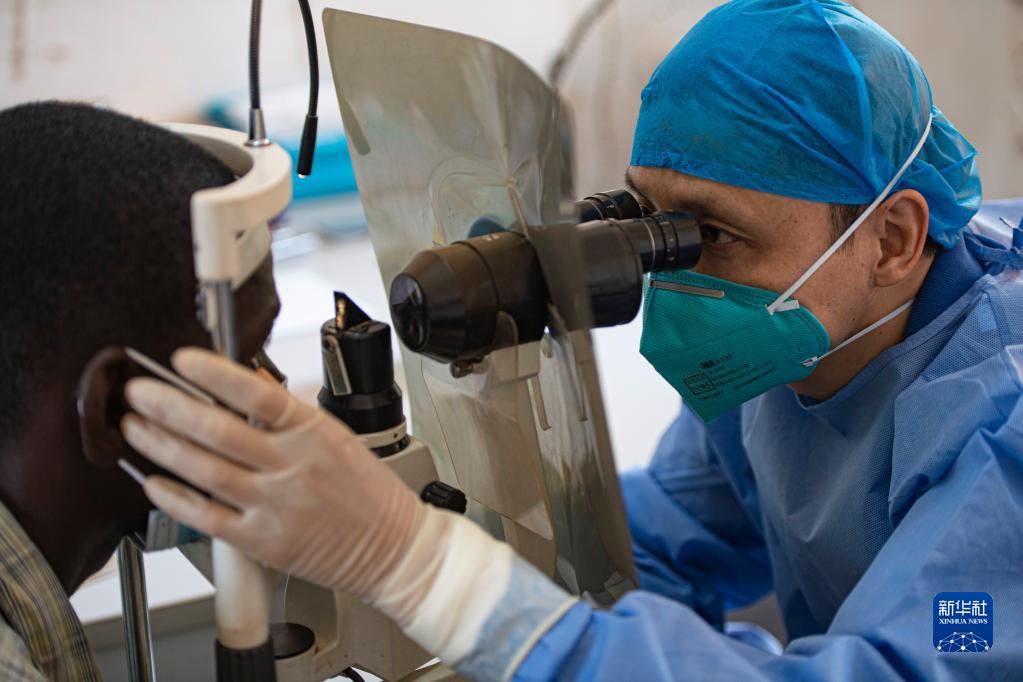 2月13日,在中非共和国首都班吉友谊医院,第19批援中非中国医疗队眼科医生章友美为患者做检查。