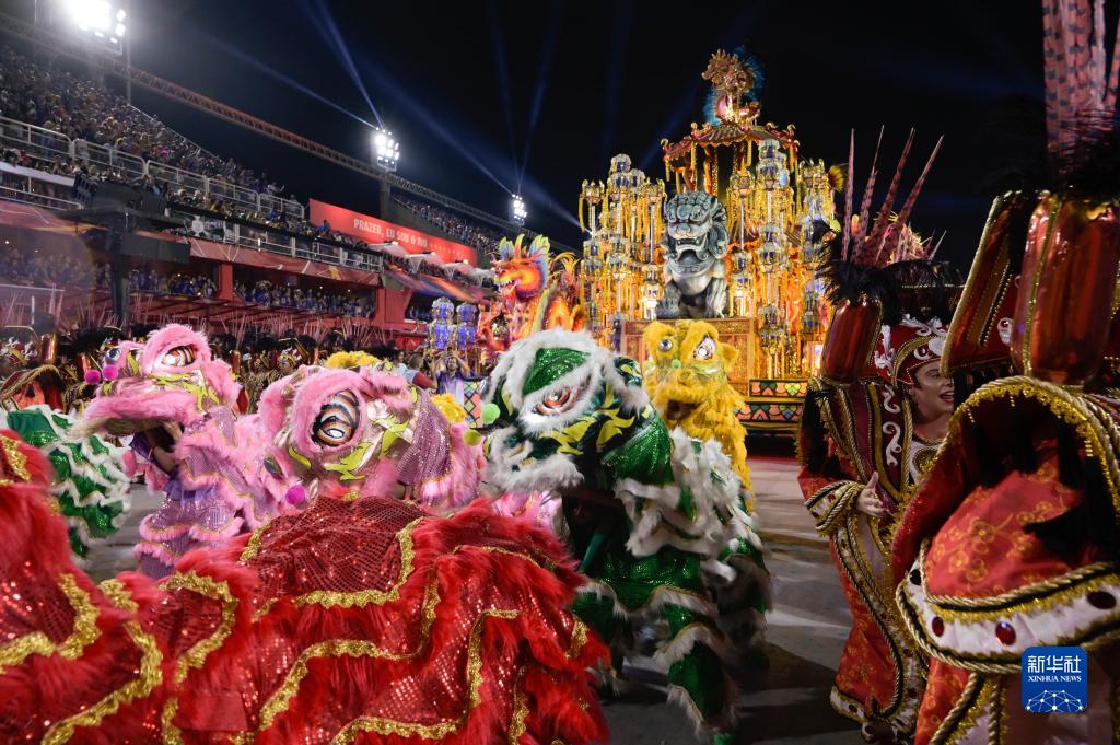 2月21日凌晨,在巴西里约热内卢桑巴大道,一辆以中国文化为主题的桑巴舞校花车参加狂欢节游行。