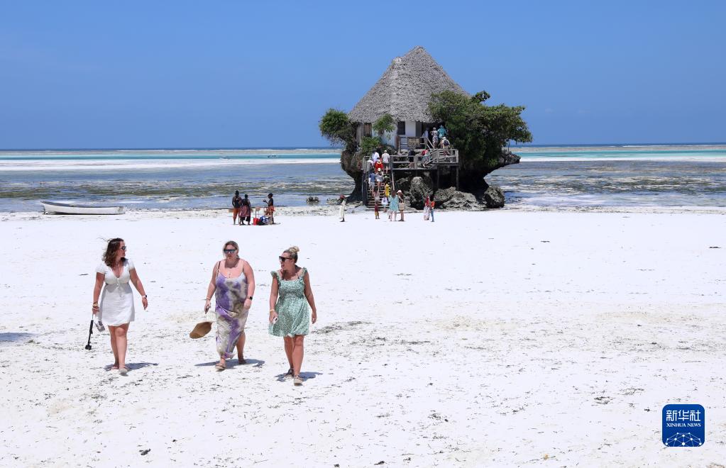 2月24日,游客在坦桑尼亚桑给巴尔岛的岩石餐厅附近游览。