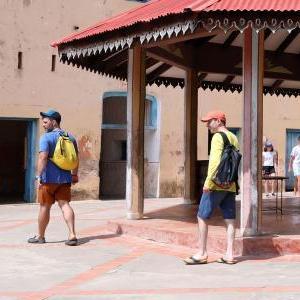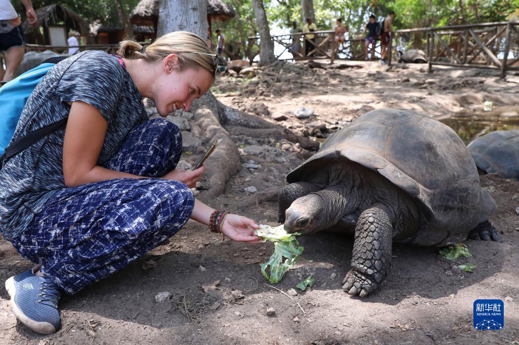 2月23日,游客在坦桑尼亚桑给巴尔岛给陆龟喂食。