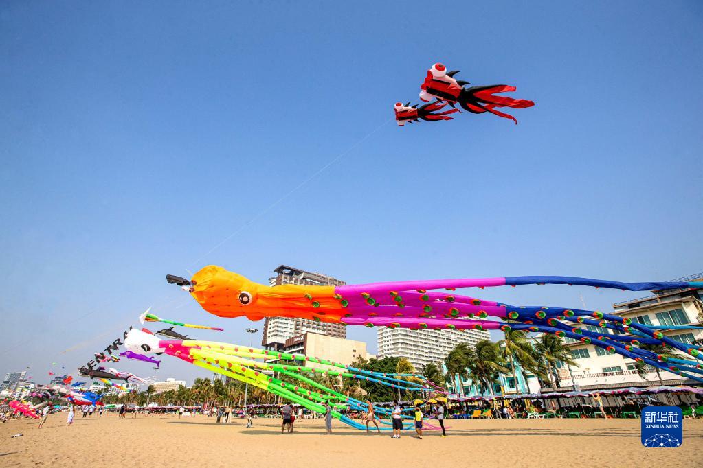 这是2月27日在泰国芭提雅海滩拍摄的大型风筝。泰国芭提雅近日举办海滩风筝节。