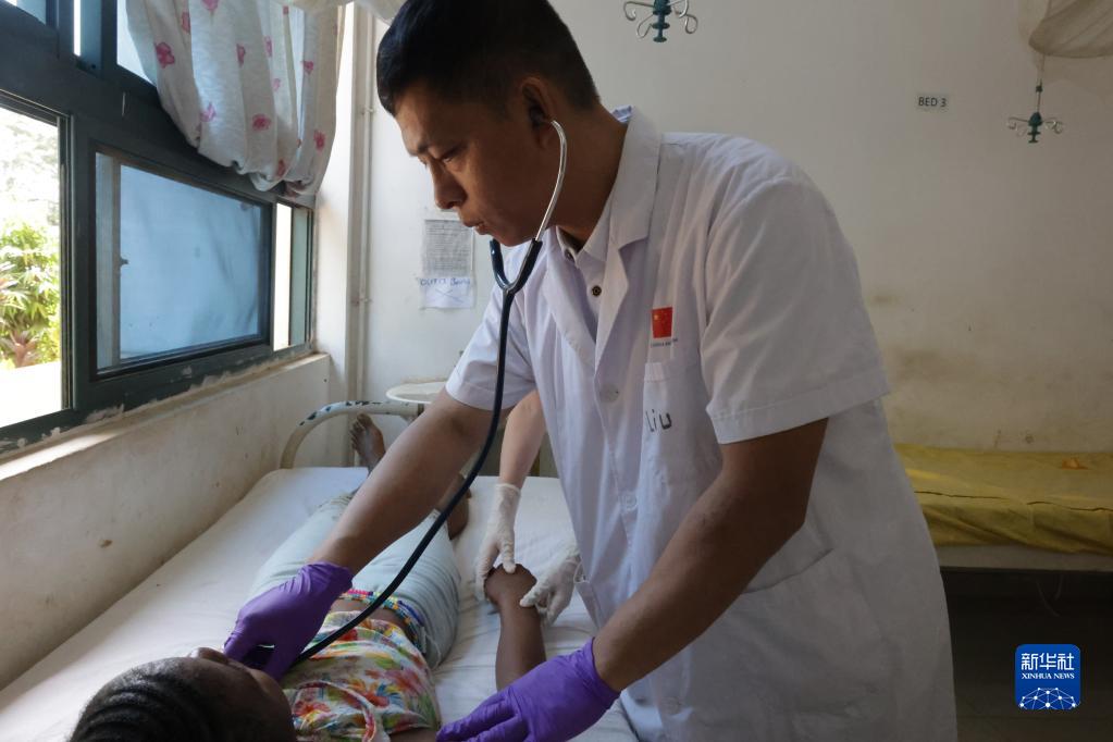 2月27日,在位于塞拉利昂首都弗里敦市郊的塞拉利昂-中国友好医院,一名中国医疗队医生为患者检查身体。