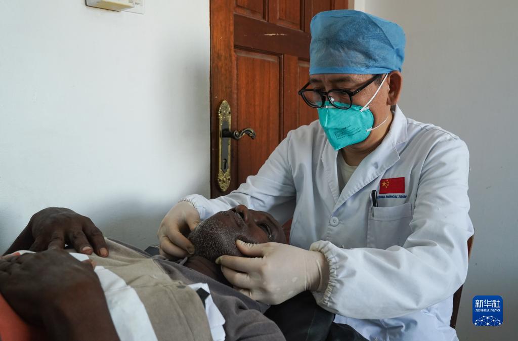 2月28日,在吉布提首都吉布提市贝尔蒂耶医院,中国第21批援吉布提医疗队医生连新刚为当地患者诊治。