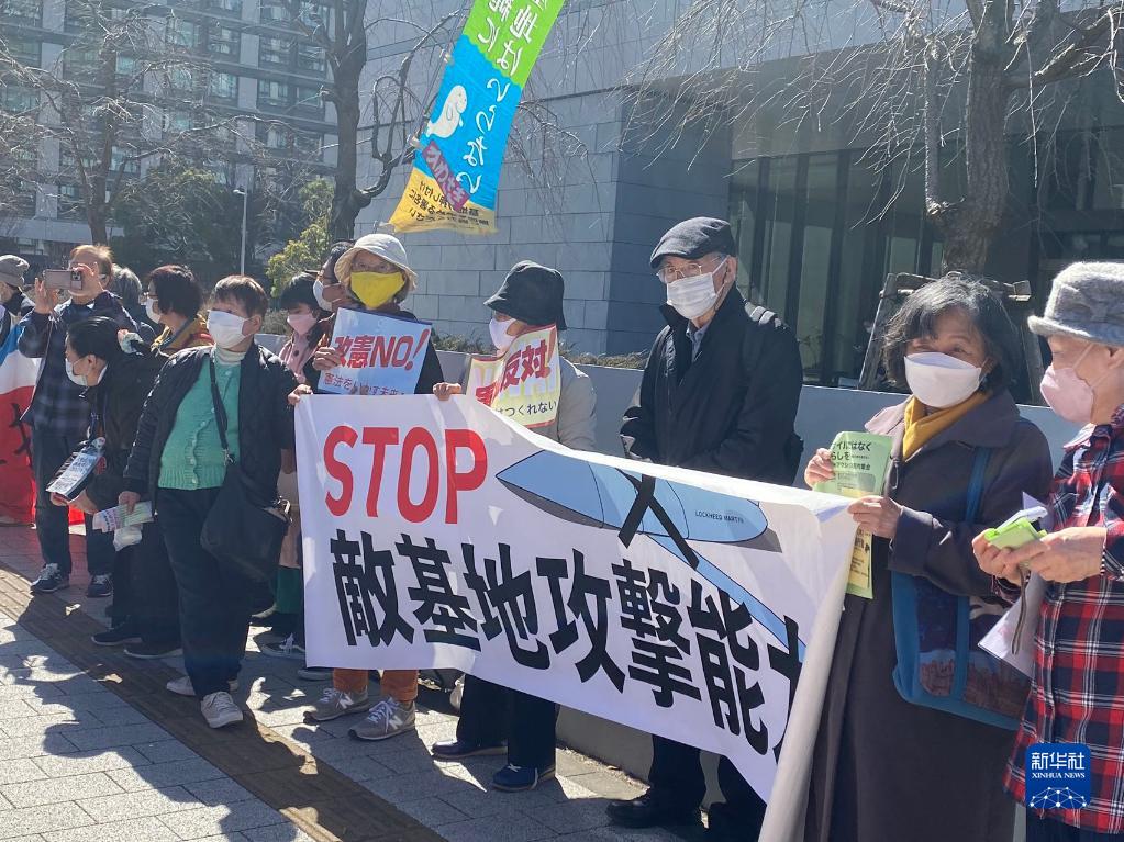 2月28日,在日本东京,日本民众举着标语牌抗议日本众议院通过高额的防卫费预算案。