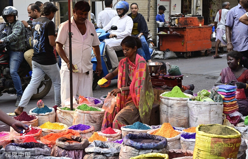 当地时间3月5日,印度孟买,在胡里节庆祝活动之前,人们在市场摊位上购买彩色粉末。(图片来源:视觉中国)