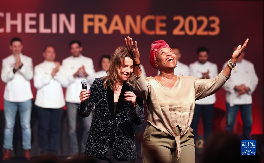 3月6日,在法国东部城市斯特拉斯堡举办的2023《米其林指南》法国版发布仪式上,获颁米其林一星的原籍贝宁的法国厨师乔治亚娜·维乌(前右)庆祝。
