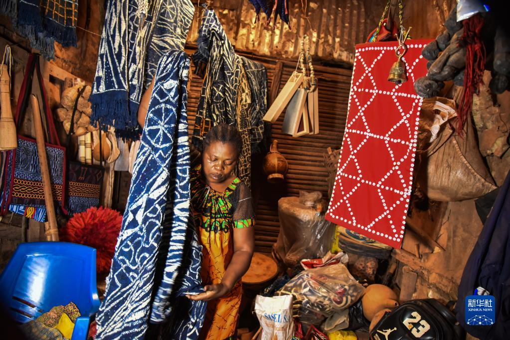 3月3日,喀麦隆西部大区巴富萨姆,卖家展示恩多普布料。