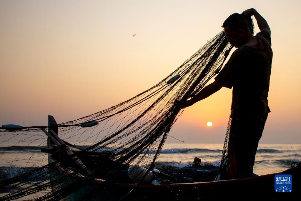 3月7日清晨,渔民在印度尼西亚亚齐省司马威的海岸边整理渔网准备出海捕鱼。