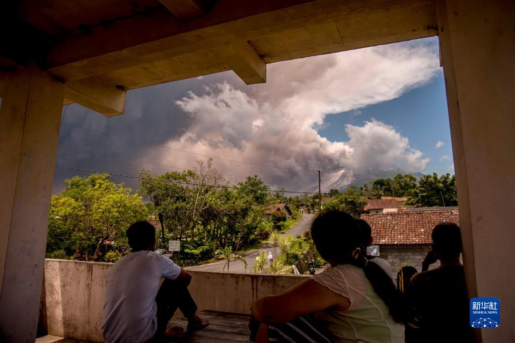 3月11日,在印度尼西亚日惹,人们望向喷发的默拉皮火山。