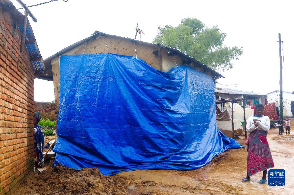 3月14日,在马拉维南部的布兰太尔地区,一名女子站在一栋用塑料布覆盖的房子旁。