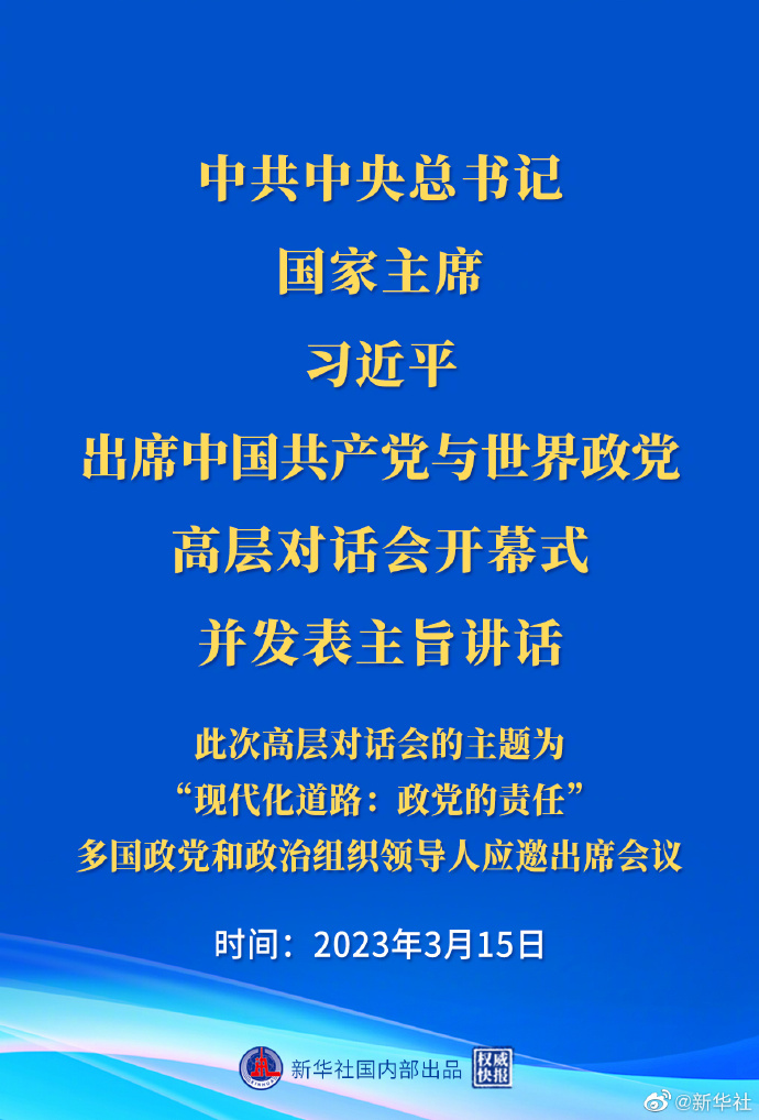 北京时间3月15日,中国共产党与世界政党高层对话会以视频连线方式举行,中共中央总书记、国家主席习近平出席高层对话会开幕式并发表主旨讲话。此次高层对话会的主题为“现代化道路:政党的责任”,多国政党和政治组织领导人应邀出席会议。 ​​​