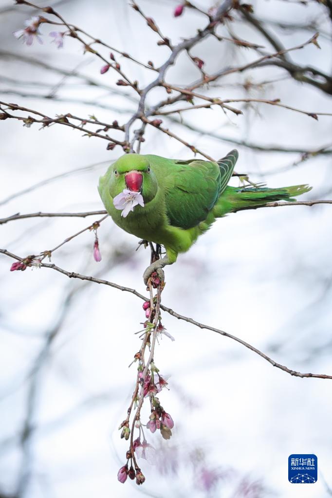 3月15日,一只鹦鹉在比利时布鲁塞尔五十周年纪念公园的枝头觅食。