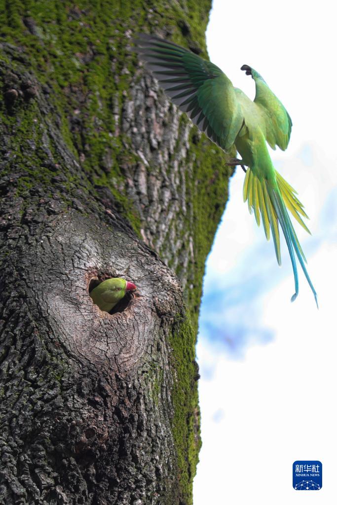 这是3月15日在比利时布鲁塞尔五十周年纪念公园拍摄的两只鹦鹉。