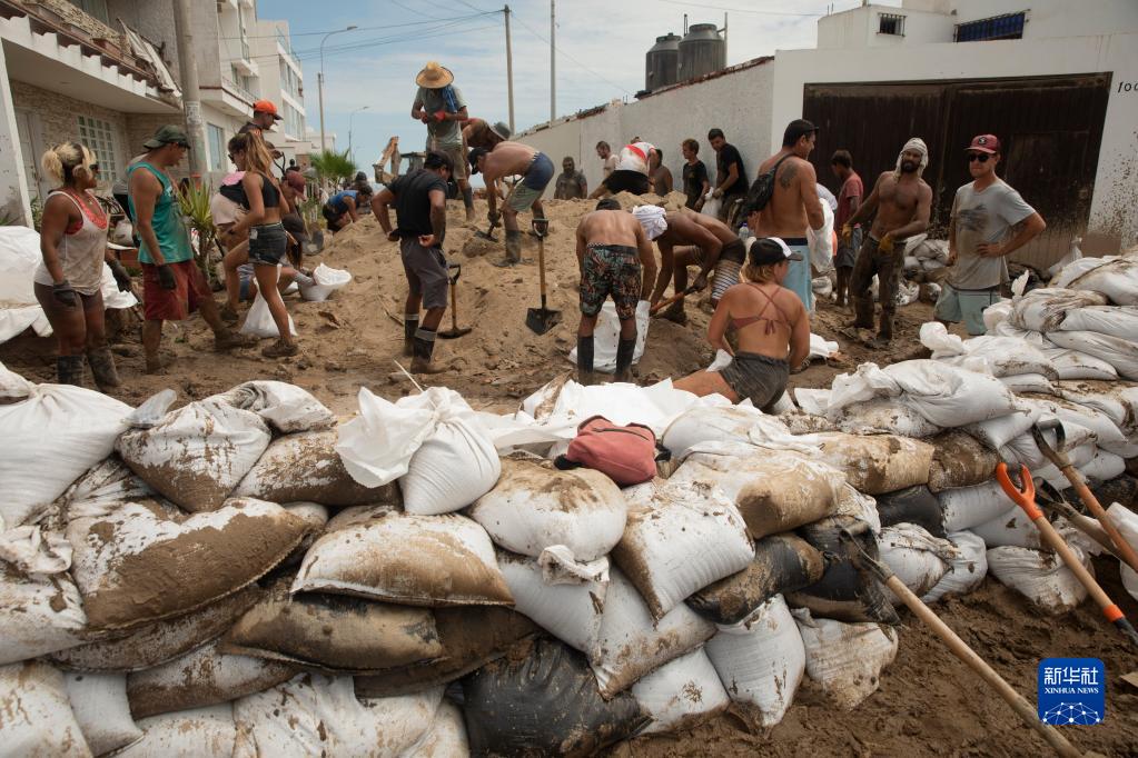 3月16日,人们在秘鲁首都利马南部的蓬塔赫尔莫萨地区建造临时堤坝,以阻挡暴雨造成的泥石流。